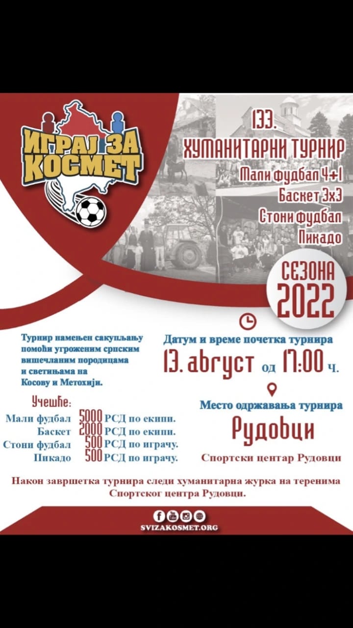 U subotu 13. avgusta od 17.00 časova na terenima Sportskog centra u Rudovcima, organizuje se 133. humanitarni turnir za pomoć porodicama na Kosovu i Metohiji.