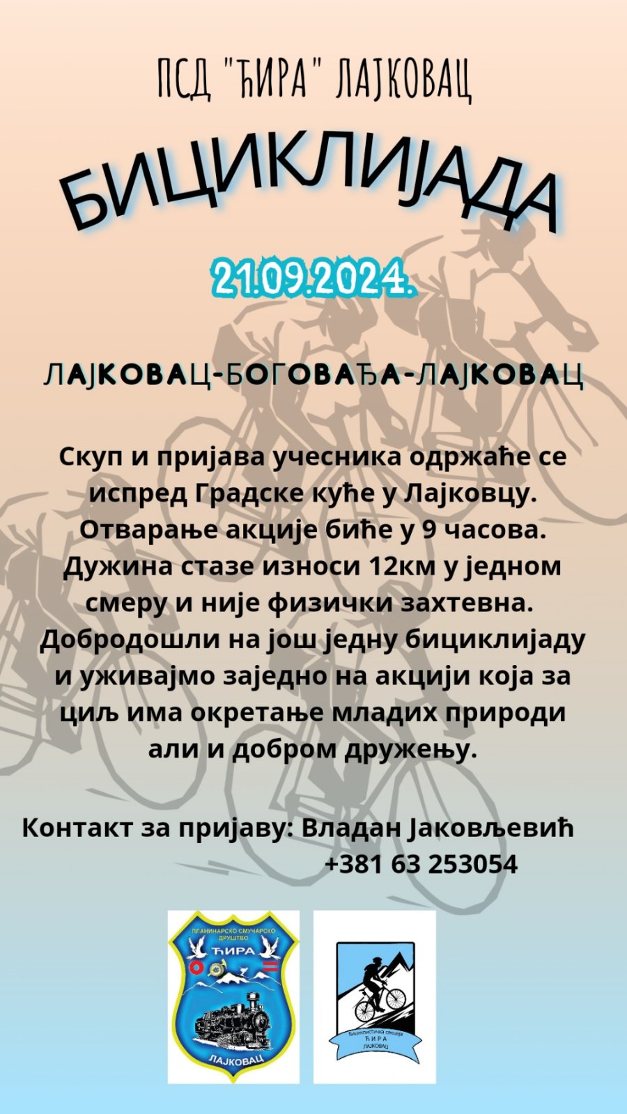 PSD Ćira iz Lajkovca u suboru 21. septembra organizuje biciklijadu na deonici Lajkovac – Bogovađa – Lajkovac. Dužina staze je 12 km u jednom smeru i nije fizički zahtevna.