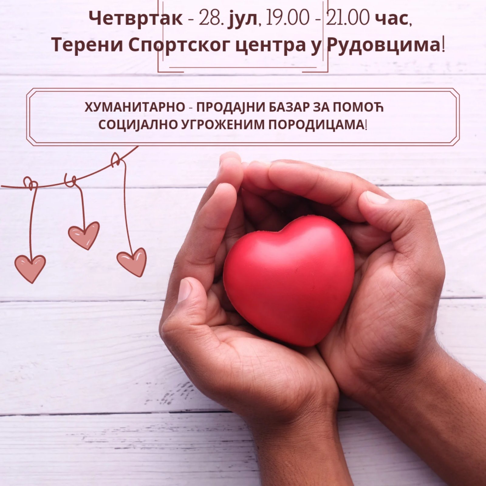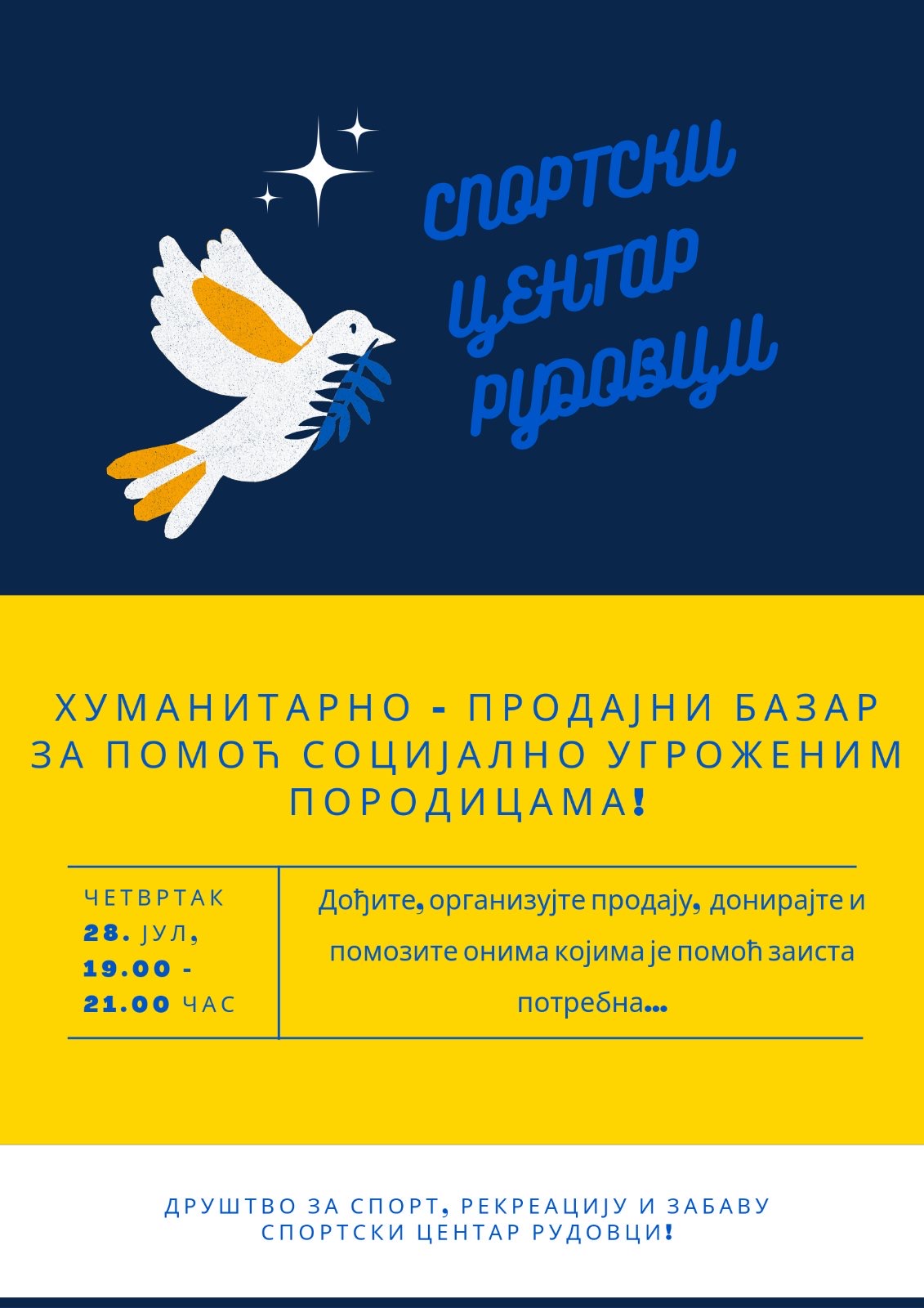 Društvo za sport, rekreaciju i zabavu – Sportski centar Rudovci u četvrtak – 28. jula. 2022. godine, od 19.00 časova do 21.00 čas, na terenima sportskog centra, organizuje „Humanitarno – prodajni bazar za pomoć socijalno – ugroženim porodicama“.