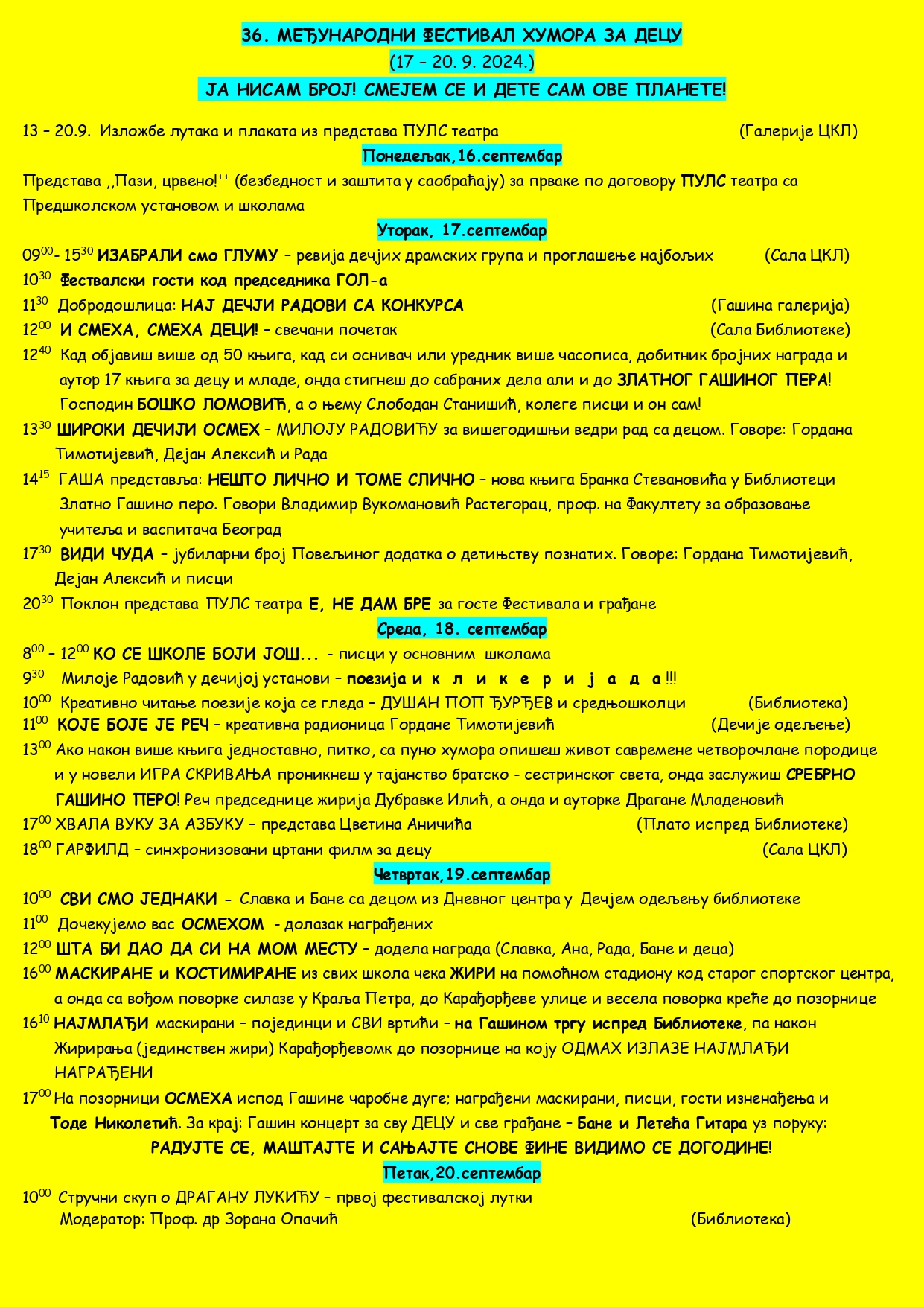 Od 17. do 20. septembra 2024. u Lazarevcu će biti organizovan 36. Međunarodni festival humora za decu pod sloganom „Ja nisam broj! Smejem se i dete sam ove planete!“.